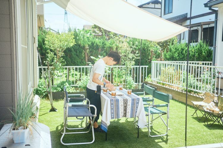 かつじろう ここにタープを立てて、キャンプみたいにすることもあります。庭の日よけの下にはテーブルを広げたり。やってみましょうか?