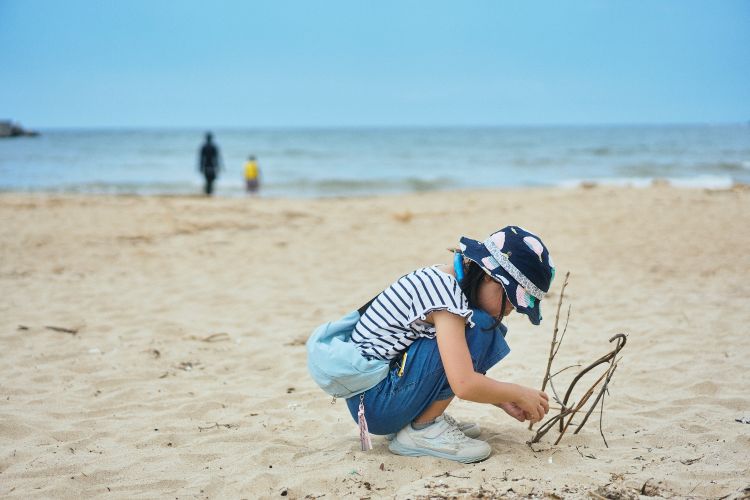 かつじろう (浜に着くとしほちゃんは砂浜で貝拾いを始めた)すてきなビーチですね。ここら辺が福間海岸で、この先にいくと宮地浜になります。